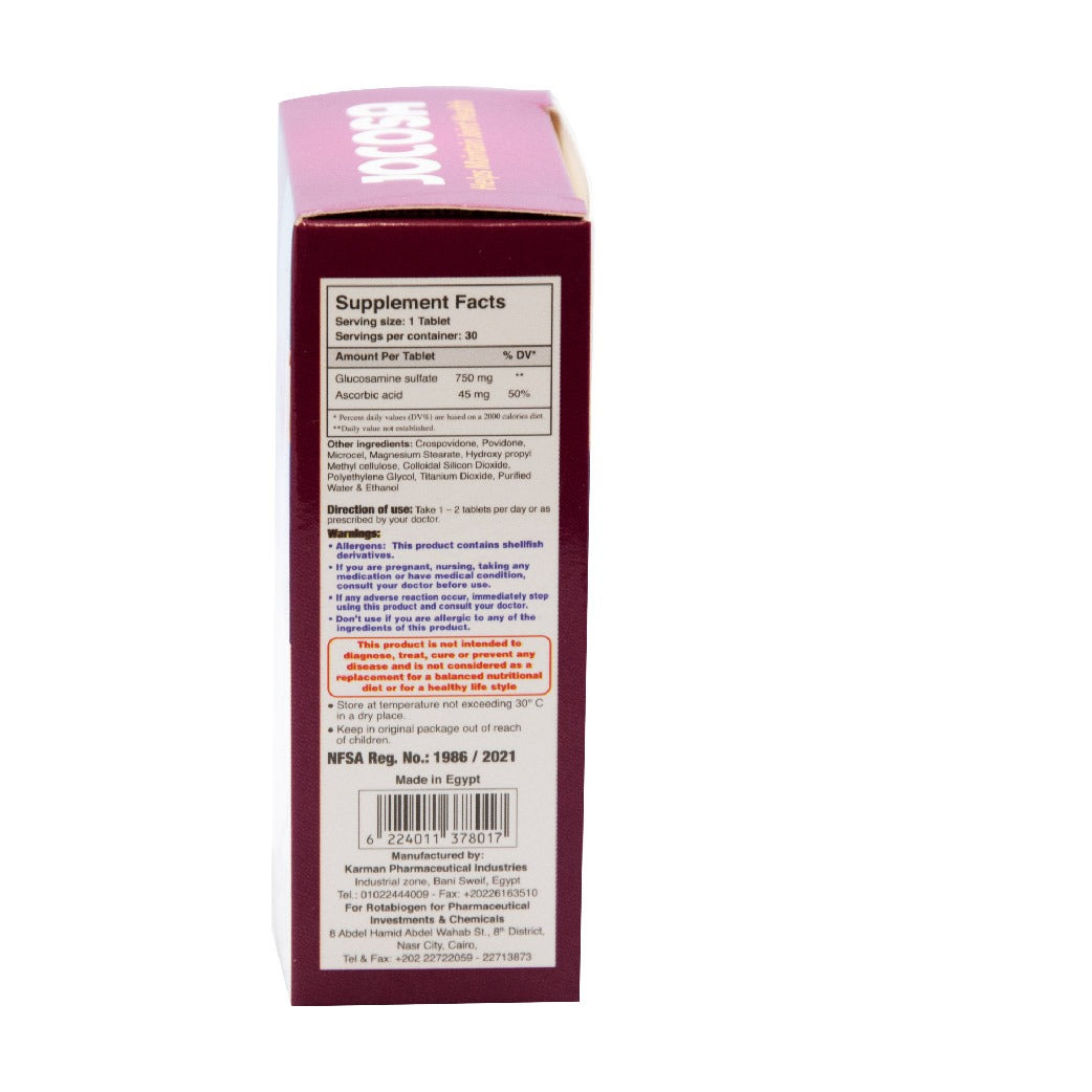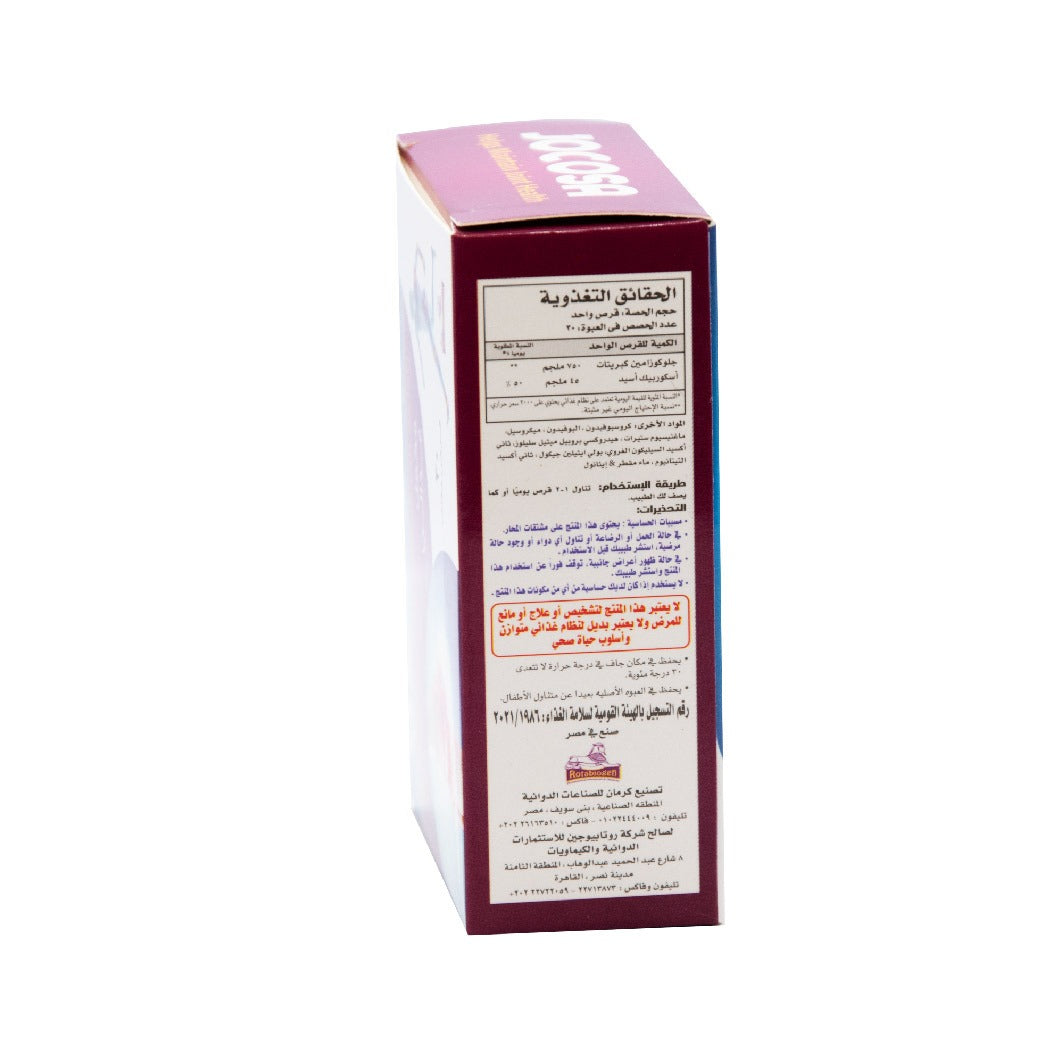 | Jocosa is a dietary supplement that supports joint and bone health, helps reduce pain and symptoms of osteoarthritis, and improves joint flexibility. Benefits: Stimulates collagen production Reduces cartilage erosion and promotes the production of joint lubricating fluids Ingredients: Each capsule contains: 750 mg Glucosamine Sulfate 45 mg Vitamin C Dosage and Use: Take 1–2 capsules daily. |
